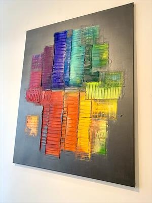 Marvellous multicoloured, deeply textured and reflective one-off original art! Created over a dark metallic grey background with all the colours of the rainbow! 100 cm x 80 cm x 1.5 cm.